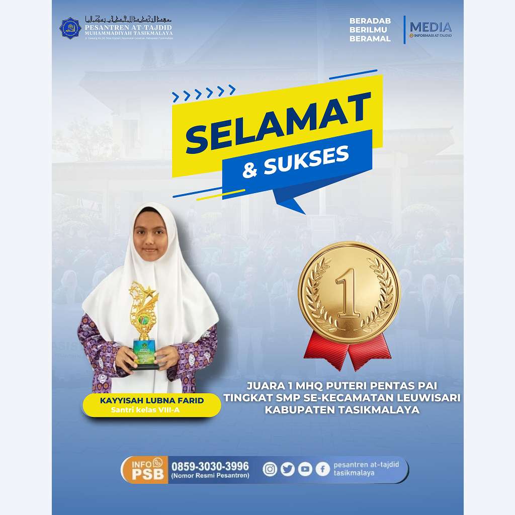 Dalam cabang MHQ Puteri, santri kelas VIII A, Kayyisah Lubna Farid, berhasil tampil luar biasa dan meraih Juara 1. Kemampuannya dalam menjaga hafalan dengan lancar dan tartil, serta tampil dengan tenang di hadapan juri, menjadi kekuatan utama yang mengantarkannya menuju podium tertinggi. Prestasi ini menunjukkan dedikasi tinggi Kayyisah dalam menghafal Al-Qur’an dan menjadi kebanggaan bagi seluruh keluarga besar At-Tajdid.